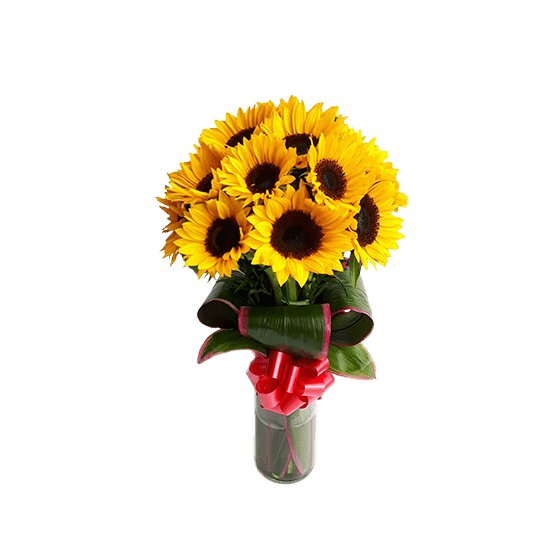 Hermoso arreglo de girasoles con hojas decorativas, para dedicarle un día lleno de alegría.