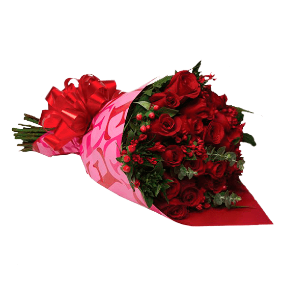 Embárcate en un viaje de pasión y elegancia con nuestro ramo de rosas rojas y follaje.